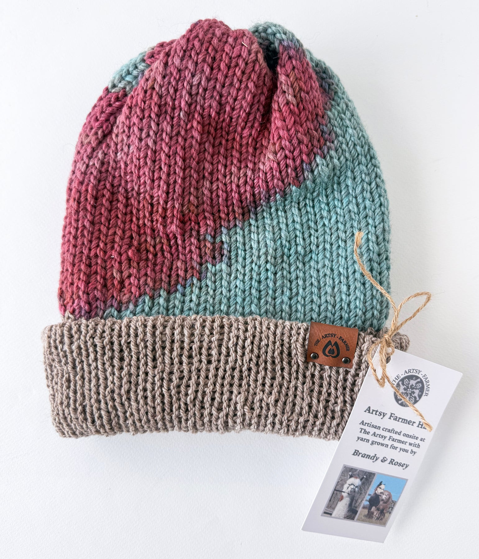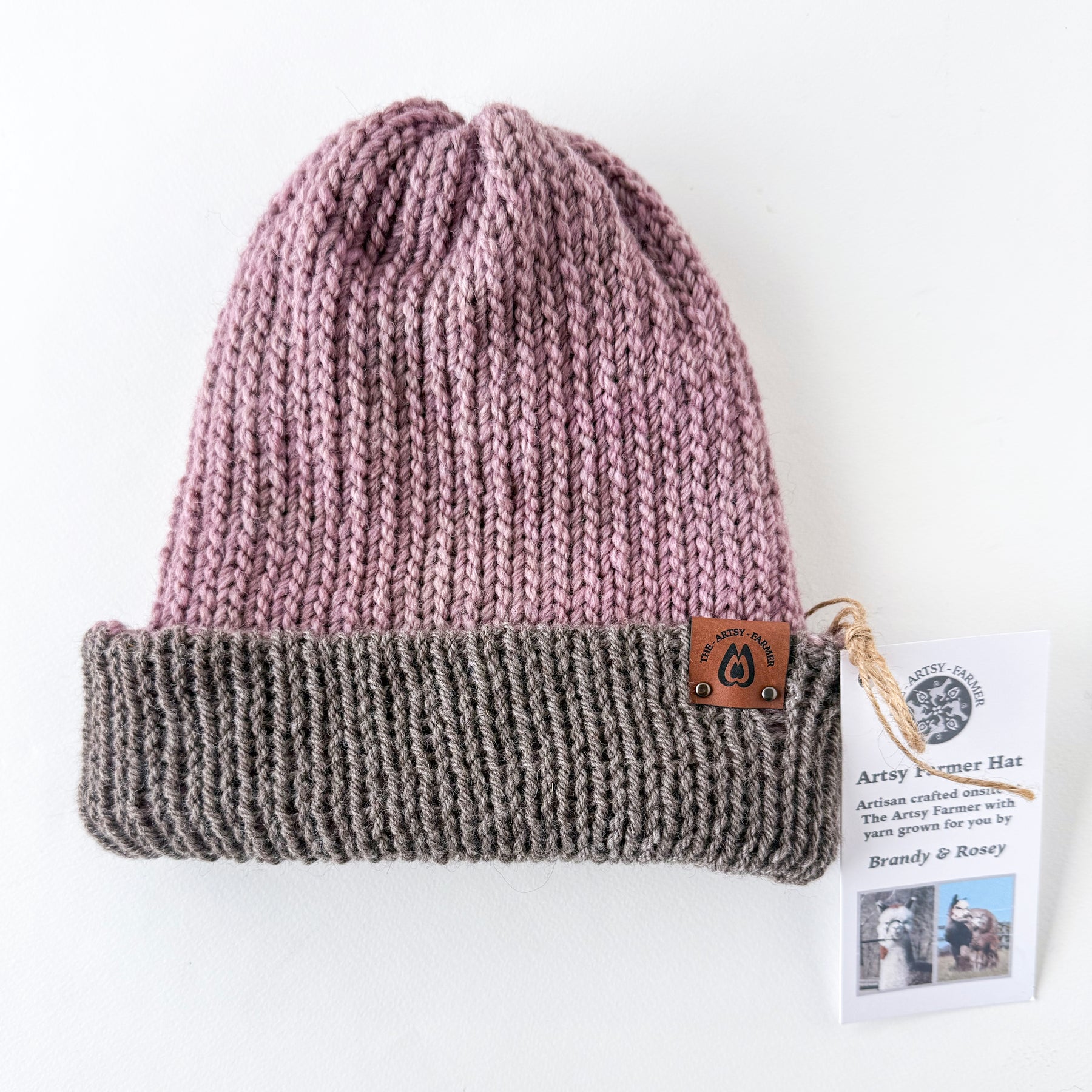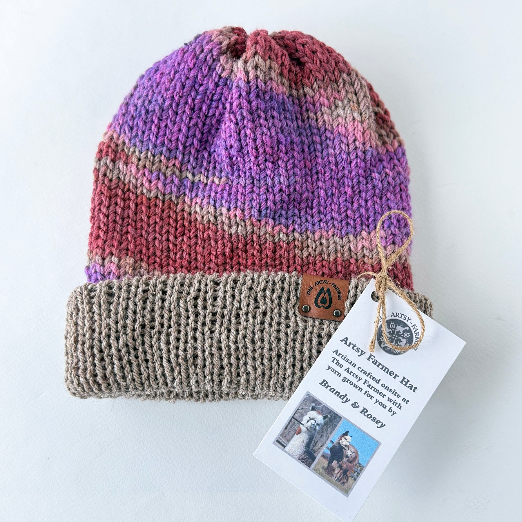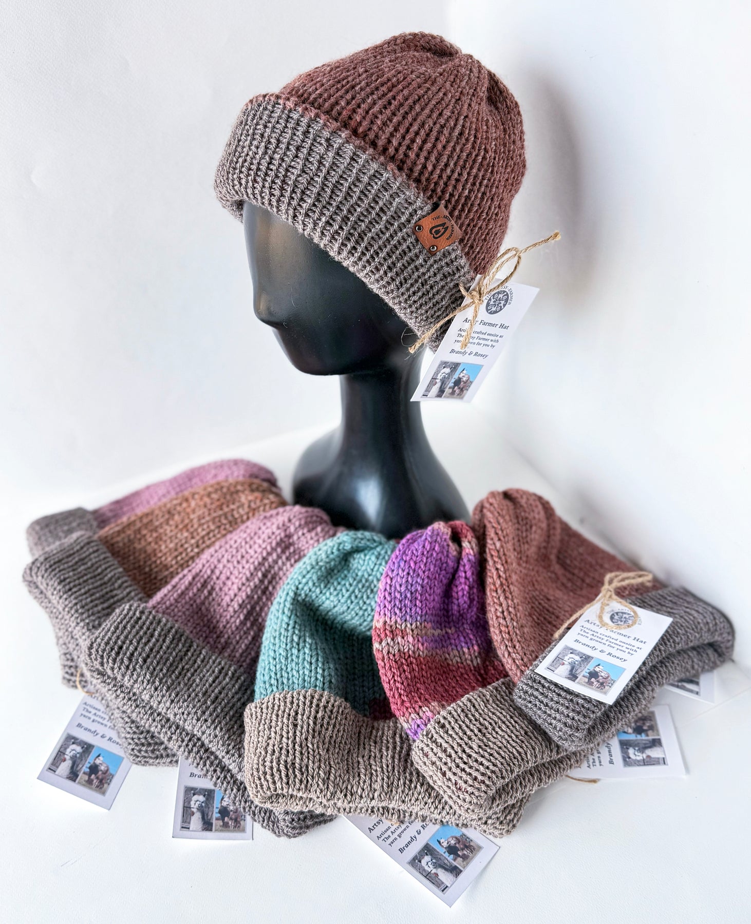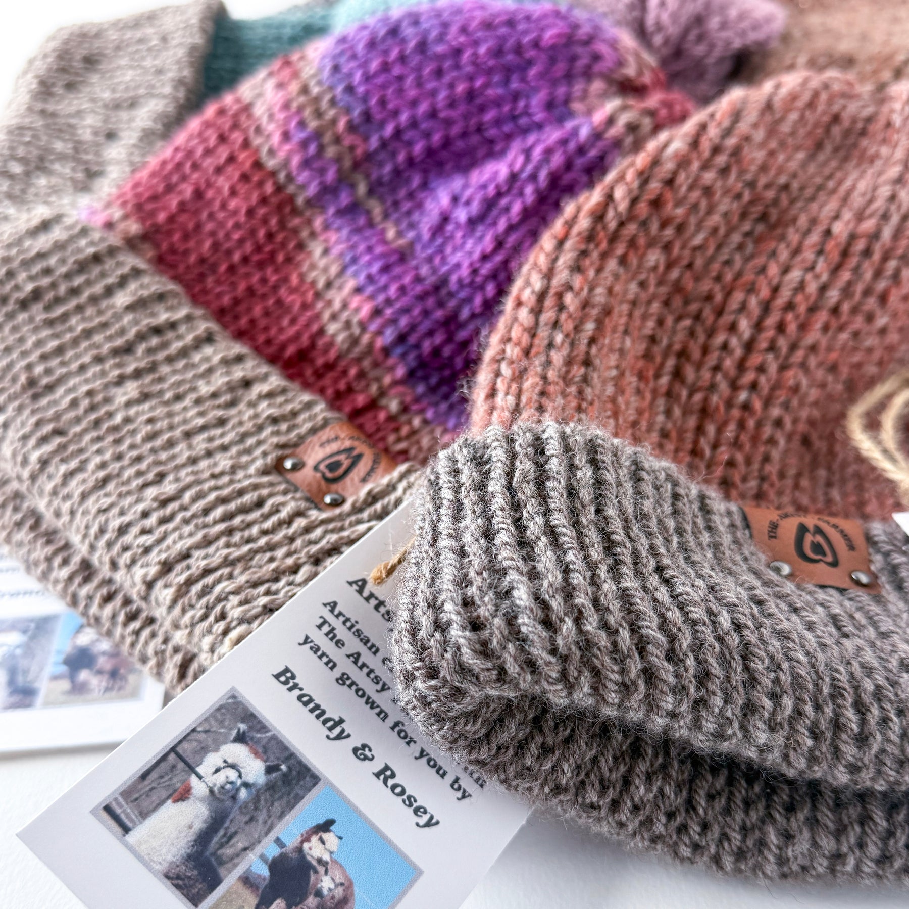 Looking for soft, warm hats that are also colorful and fun? Then look no further! This Brandy/Rosie collection of hats are handmade on-site at The Artsy Farmer! If you’ve been on a tour at the farm, then you’ve probably met these Mamas whose fleeces were used in these hats!