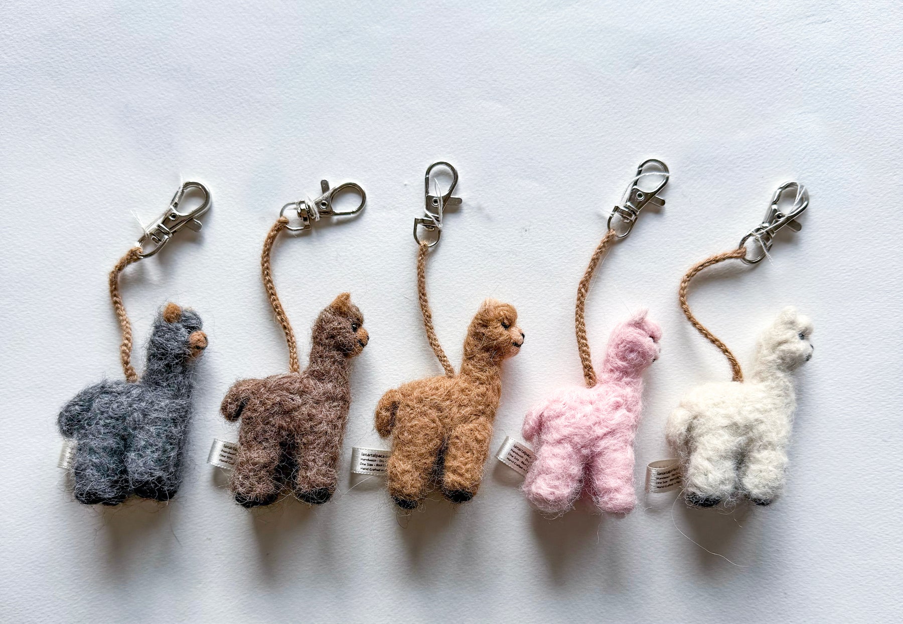 Alpaca Bag Charm. These alpacas are felted in miniature size, so they are quite adorable. They are made entirely by hand from quality alpaca fiber, and make a delightful gift for any alpaca enthusiast. These little hand crafted treasures can be used as a bag or backpack charm, keychain accessory, or car decoration to bring you joy throughout the entire day. Due to the nature of handcrafting, each piece is unique with slight variations.